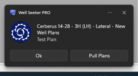 **Check for New Plans:** : If this option is checked, the local user’s computer will check the server every five minutes to see if there are any new plans associated with the well. The well status must be set to **Active** and the user must have the survey or actual wellbore open for that well. If any new plans are detected, the local user will receive a popup notification, giving them the opportunity to Pull Plans. If Pull Plans is selected, the plans will be added to the database tree. If Ok is selected, the dialog will close, but will appear again the next time the check is carried out.